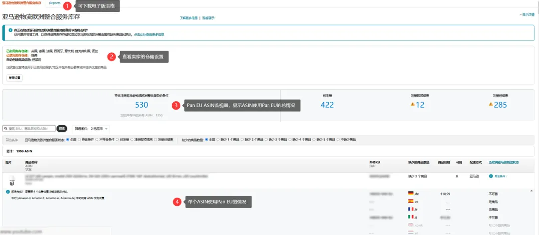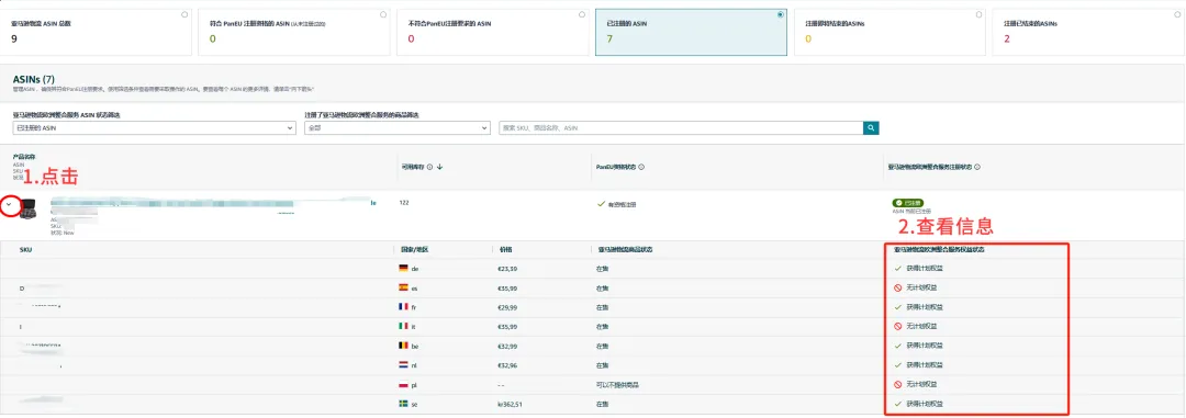 来到管理商品页面后,卖家可以根据页面提示,来分别定位已享受/未享受Pan-EU福利的ASIN。