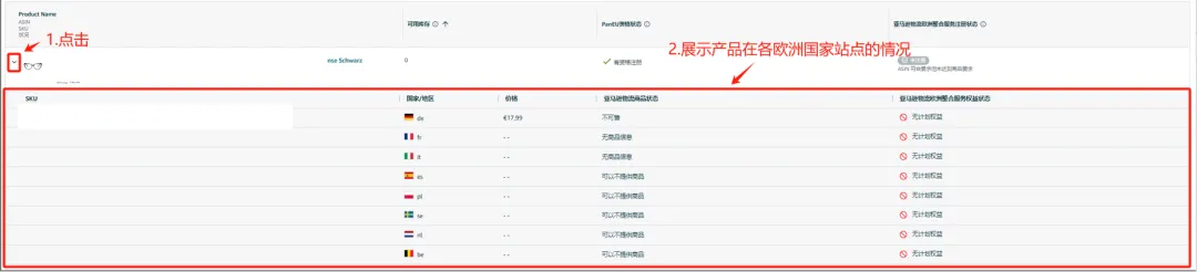 通过点击产品图片左侧的小箭头,会出现该产品在欧洲站点的详细信息(如下图),确认每个ASIN在德,法,意,西商城中的泛欧州亚马逊物流状态是否为“在售”。如果亚马逊物流商品状态处于不活动状态(例如“不可售”),需激活该ASIN在对应商城的offer,使其处于可售状态。