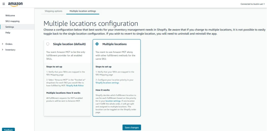 默认选项设置为单个位置。当 MCF 是您发货的唯一地点时,可使用此选项。如果您在亚马逊 MCF 以外的两个或多个配送地点库存相同的 SKU,则必须在 MCF App中打开 "多个地点(Multiple locations)"(请参阅截图)。