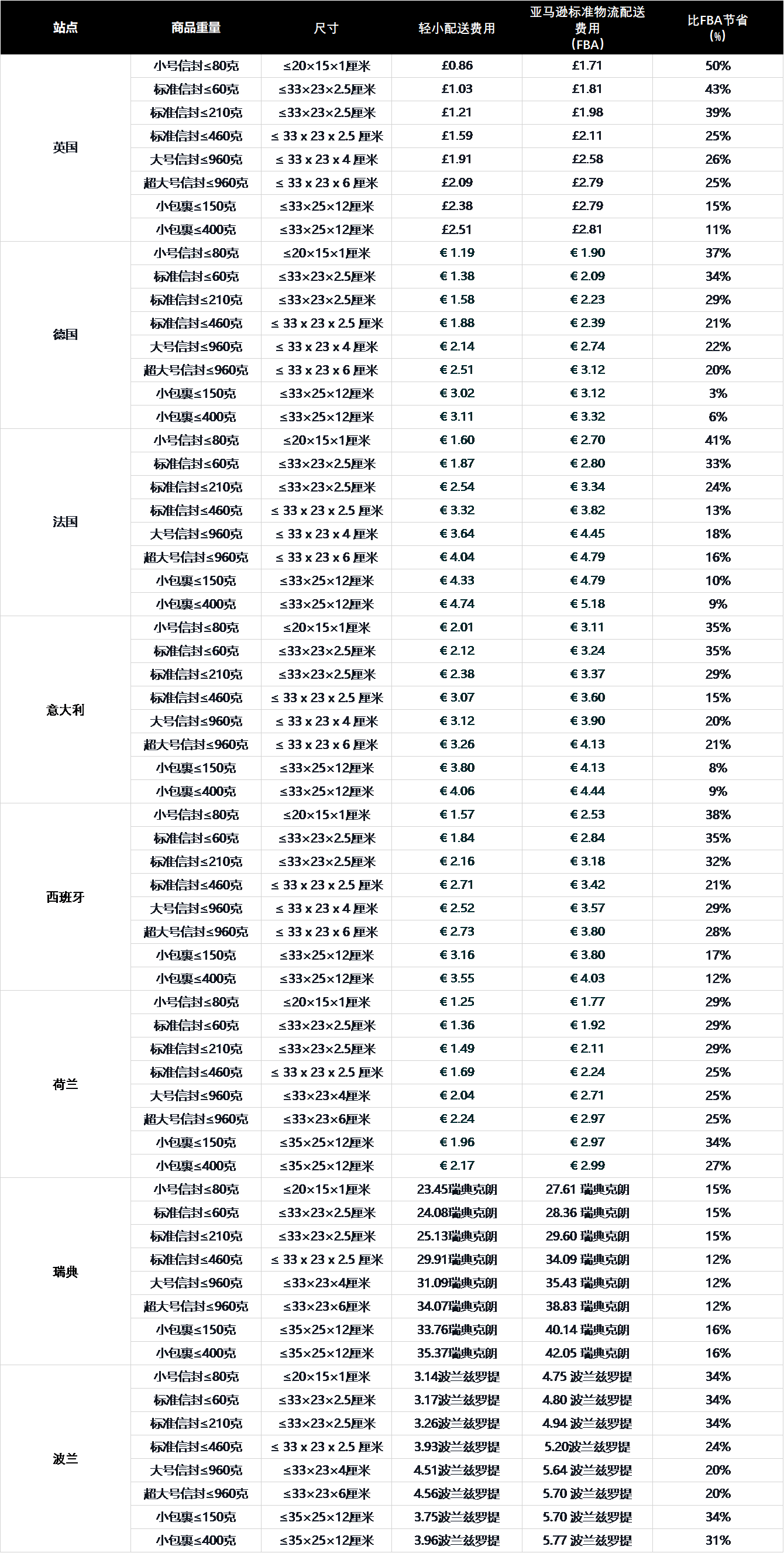 注:自 2023 年 3 月 1 日起,亚马逊将取消单独的燃油和通货膨胀附加费,并将调整标准亚马逊物流费率以将燃油和通货膨胀费用作为长期存在的成本处理。在英国站、德国站、法国站、意大利站和西班牙站新的物流费率将于 2023 年 3 月 1 日生效。在荷兰、瑞典及波兰等站点则会在2023 年 5 月 15 日生效。“轻小商品计划”配送费率也将同步发生变更。后续如有变更,以“亚马逊卖家平台”最新通知为准。