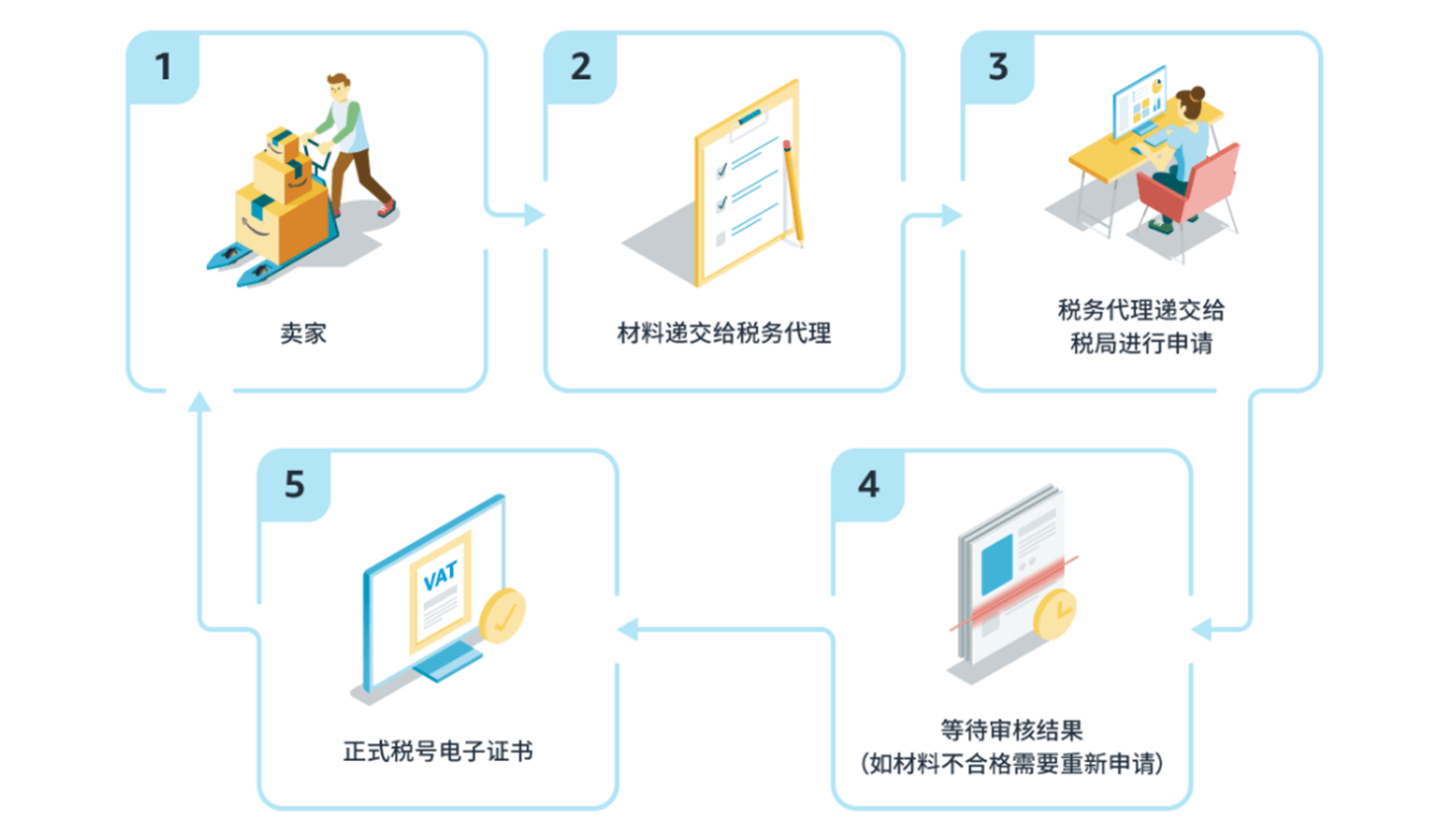 首先由卖家们把相关的材料提供给税务代理,然后由税务代理递交给税局进行增值税号的申请,在等待审核过程中如果材料不合规则需要卖家重新进行申请,完成上述步骤后,只要等待税局处理便可得到正式税号电子证书。