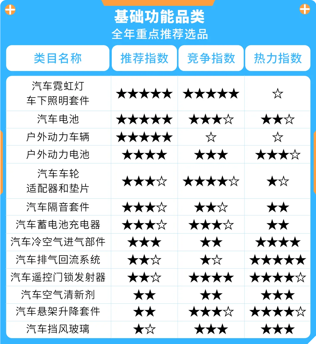 汽配细分品类众多。从汽车车系看,全球不同品牌的车对应不同的汽车配件和零部件;从应用场景看,可以分为汽车、摩托车等;从功能上看,又可以分为基础功能类、增值功能类、个性化需求类等等,体现了市场的多样化需求。汽配重点产品推荐表如下: