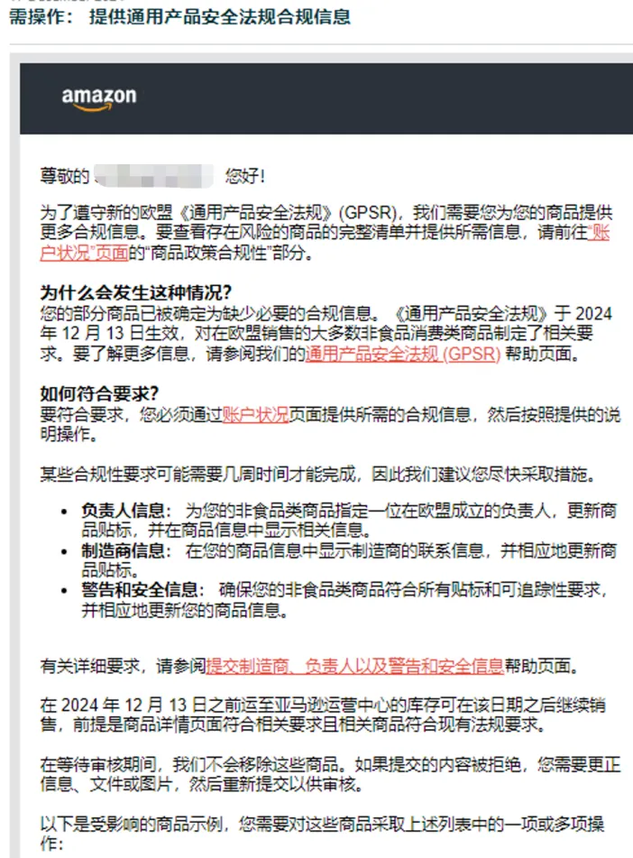 对于仍然没有完成GPSR合规的卖家,在欧盟相关站点将/已经陆续收到绩效通知(如下图)。小编建议各位卖家在春节期间应当及时关注亚马逊各类通知,并采取相应行动,避免影响销售:
