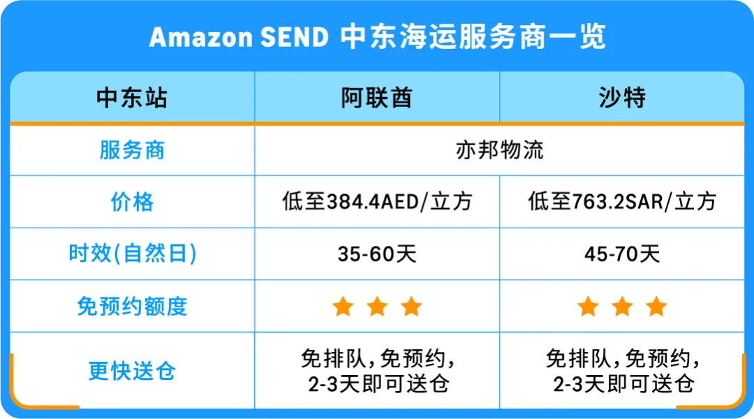 Amazon SEND继澳洲站新服务商上线之后,中东站也有新增的优选服务商上线啦!更有专属额外优惠大力出击!
