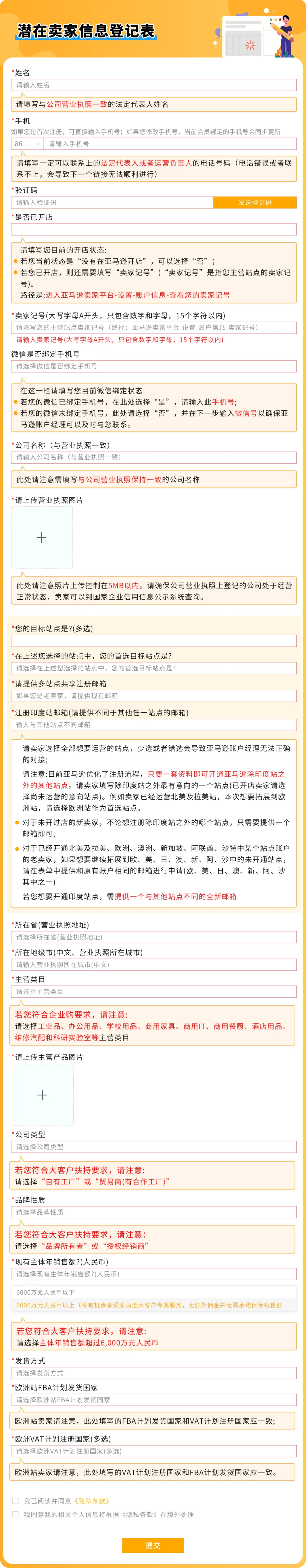 《潜在卖家信息登记表》是为了在后期为您匹配相应的账户经理,使您获得官方的精准支持与帮助扶持,因此,登记表中各项信息的准确填写至关重要。比如,信息表中的邮箱必须与正式注册时填写的邮箱一致。为了保障后续店铺的顺利注册,请您务必确保每项信息的规范填写。