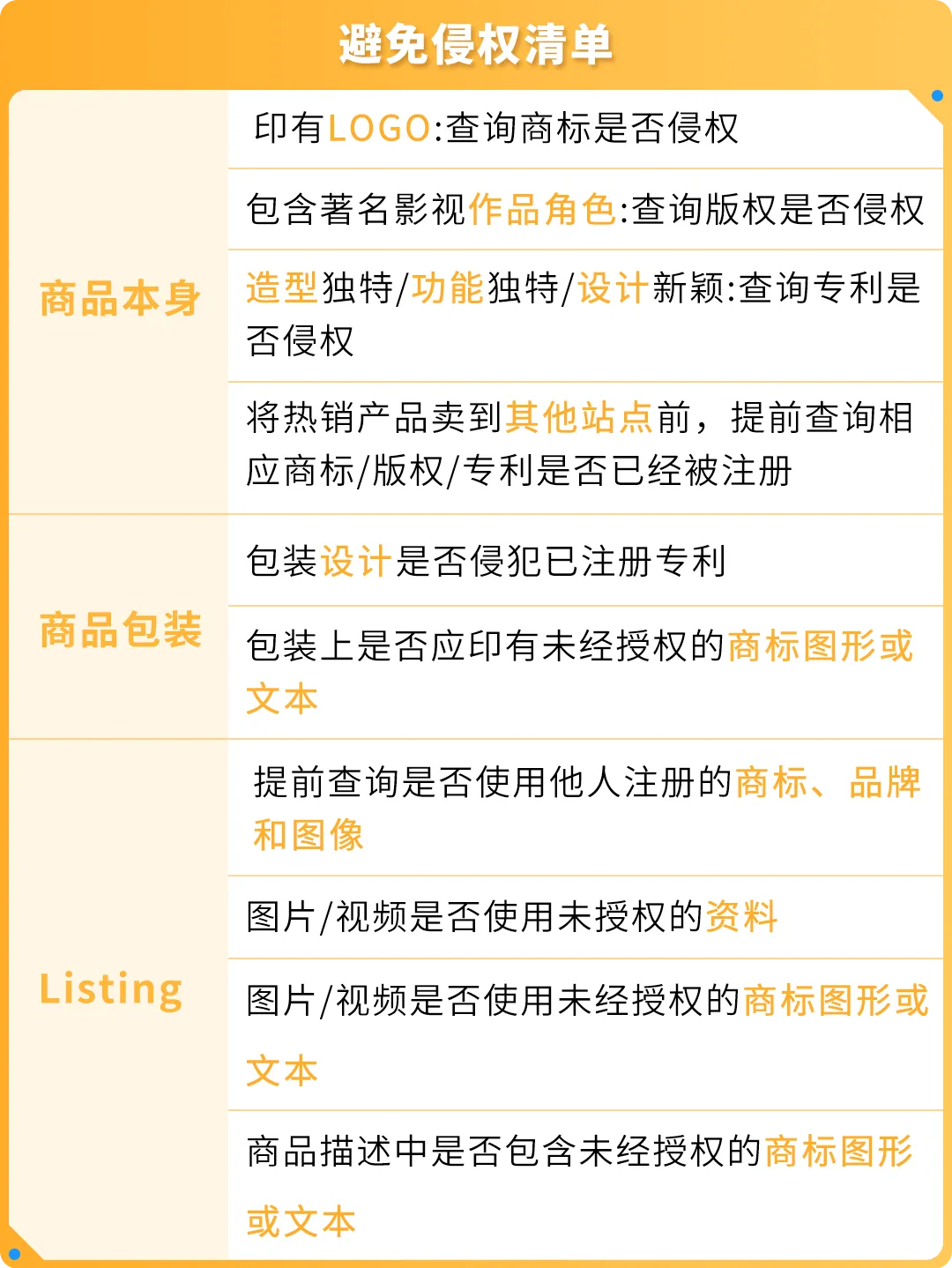 在第一重保护中,推广方案必须避免侵权隐患,您可以参照下方表格自查自纠: