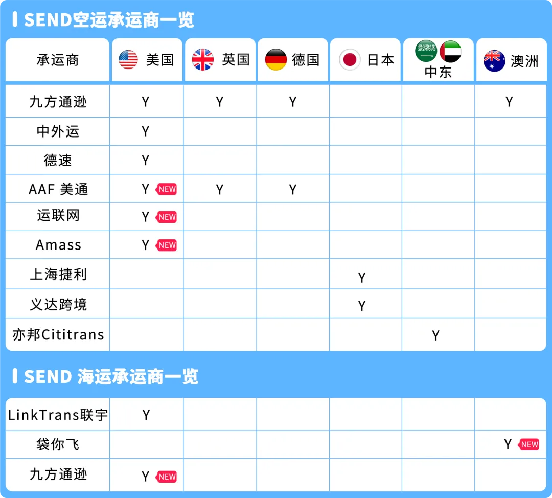 Amazon SEND 美国站和澳洲站新增承运商:Amass,运联网,AAF 美通,九方通逊,袋你飞,满足更多紧急补货、高客单价产品发货的需求。