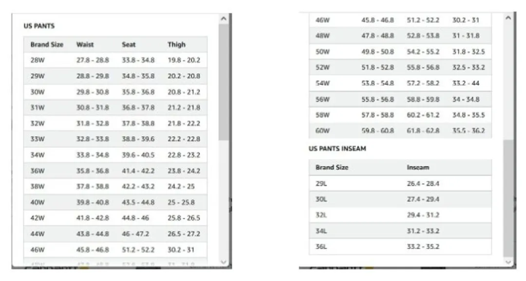 👉 如果29L的内侧缝长度为29英寸,则无需第二张表格(一张表格):