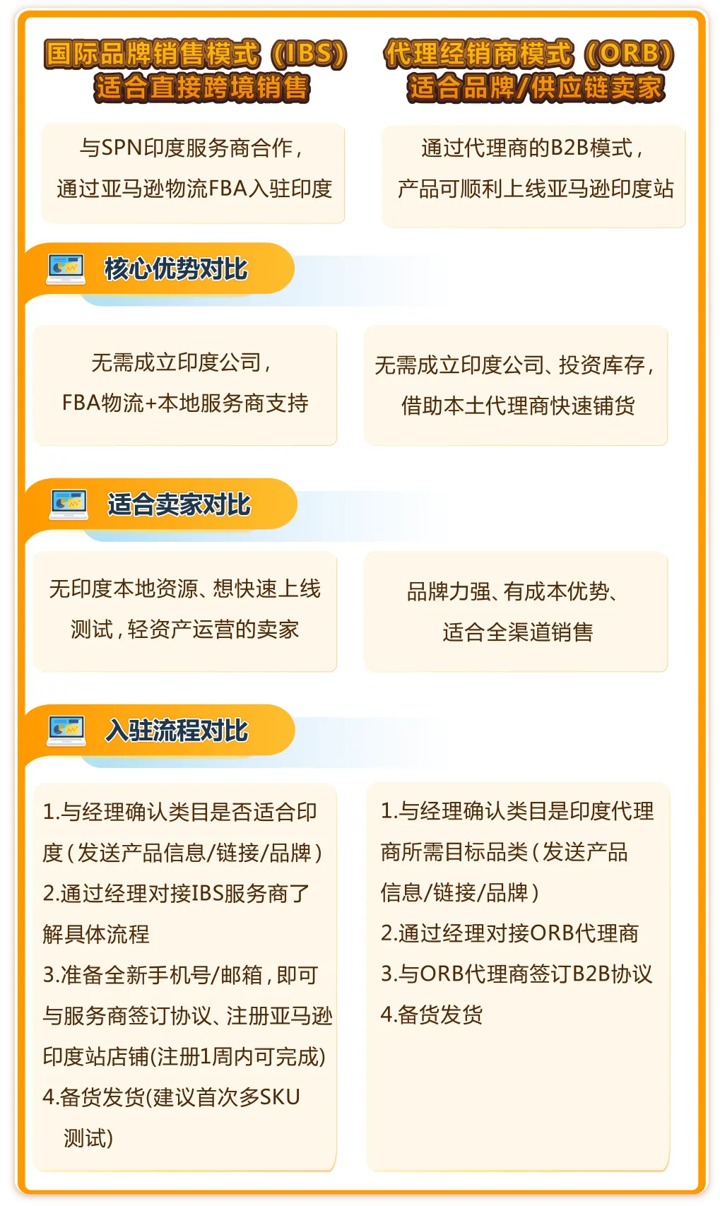 目前,亚马逊为中国卖家开通了2种入驻模式——国际品牌销售模式(IBS),代理经销商模式(ORB)。卖家可以根据自身情况选择适合的路径,快速抢占印度电商蓝海。