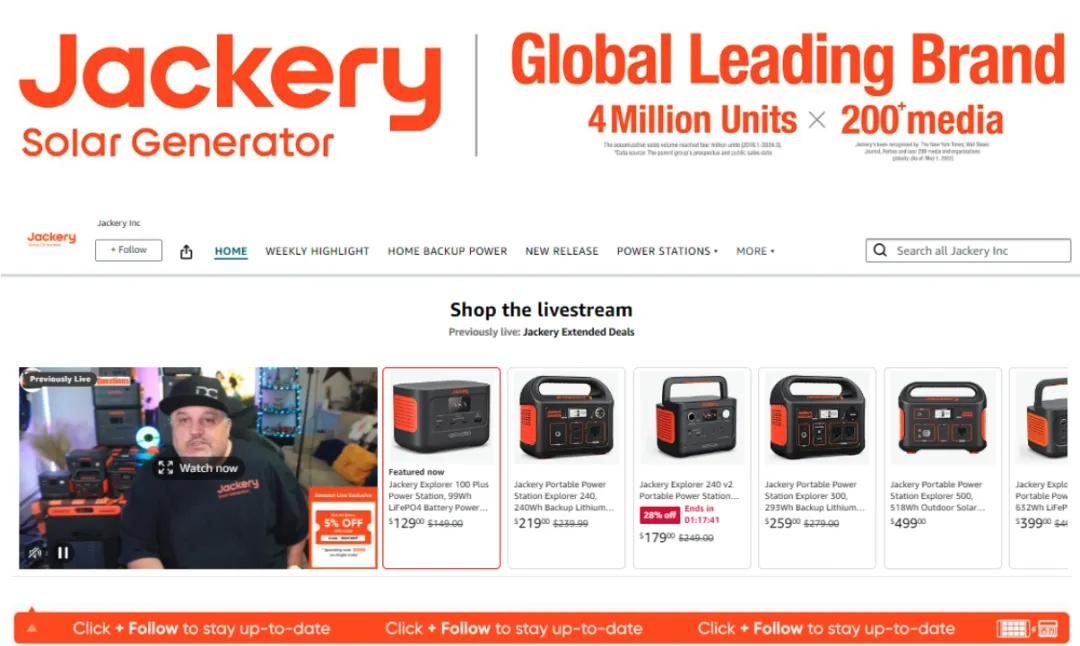 亚马逊品牌旗舰店是亚马逊品牌宣传的专属阵地,是营造与消费者互动的沉浸式品牌空间,方便卖家充分传达品牌故事,形成品牌粉丝的“流量聚宝盆”,从而提升销量和复购。在建立品牌识别度上,Jackery十分注重品牌视觉识别度的统一。无论从产品的外观设计,还是从logo、宣传语和促销识别标识等品牌识别系统,都采用十分具有科技感的亮橙色品牌色,目的是希望用户看到高频次、统一的品牌视觉宣传,进而不断增加品牌识别度。
