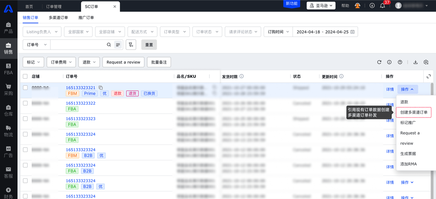 ● 订单快速补发:直接引用原有订单信息快捷创建补发亚马逊订单