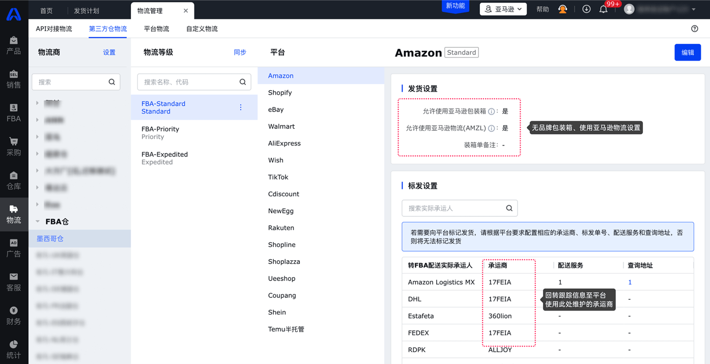 支持手动设置仓库物流为FBA仓和FBA仓物流方式