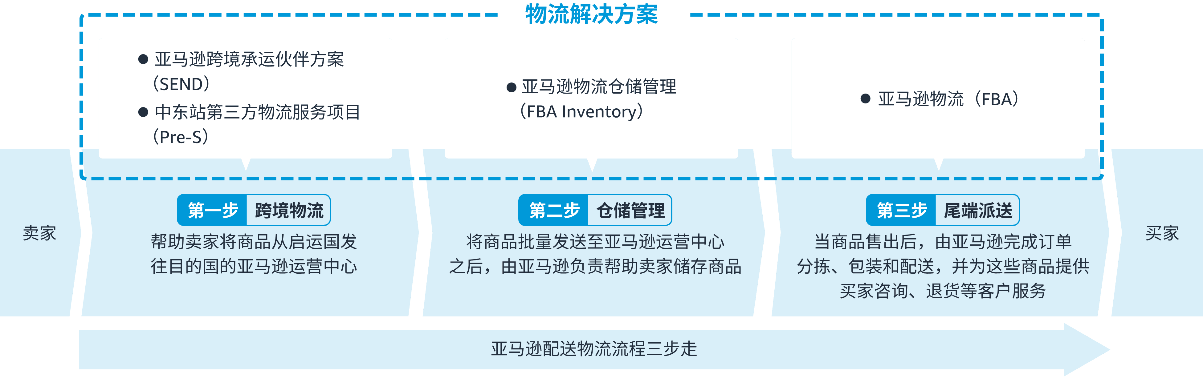 由亚马逊及第三方物流服务商提供跨境物流、仓储管理及尾端派送服务,即将商品配送至海外亚马逊仓库,并由亚马逊完成后续配送及售后服务。目前,亚马逊在阿联酋及沙特提供的物流解决方案包括:中东站第三方物流服务项目Pre-S、亚马逊跨境承运伙伴方案(SEND)亚马逊物流新选品计划亚马逊物流仓储管理(FBA Inventory) 亚马逊物流 (FBA) 亚马逊中东站出口计划 (Export Plan)
