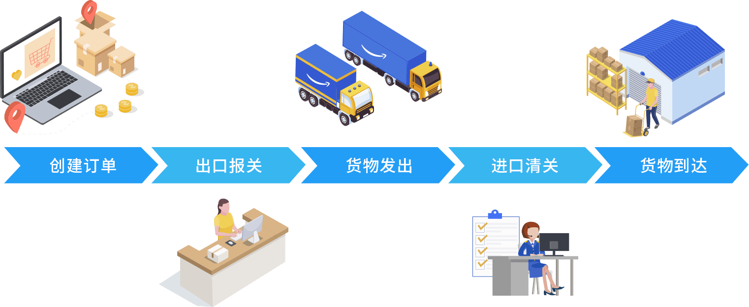 在您创建跨境物流订单后,您需要根据运输方式在发货前依据海关要求进行出口报关,并在货物抵达目的国时进行进口清关。通过下图,您可以了解到跨境物流的货物从被创建物流订单到运输至目的国所经历的全部流程。