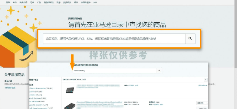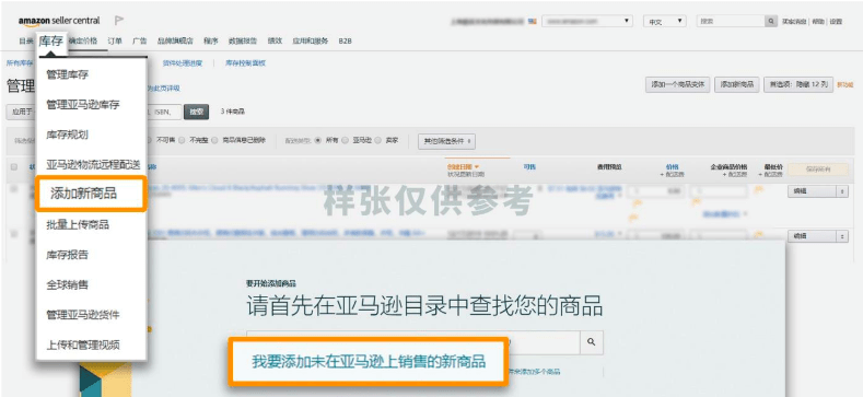1/匹配现有的商品信息(跟卖):从“库存”下拉菜单中选择“添加新商品”,然后搜索你想在亚马逊上销售的商品。如果你搜索商品编码(如UPC、EAN、JAN或ISBN),搜索结果会更准确。