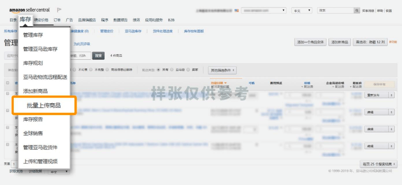 1/从“库存”下拉菜单中,选择“批量上传商品”。