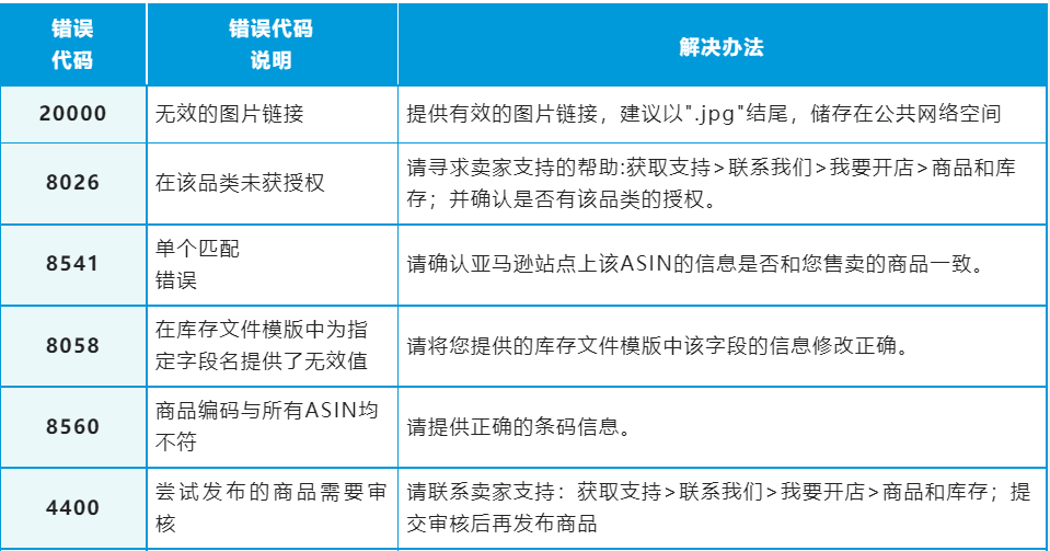 如果你遇到的问题暂未在表格中找到解决方案,你可登入亚马逊卖家平台,并在搜索框内输入“错误代码说明”查看更多处理办法。