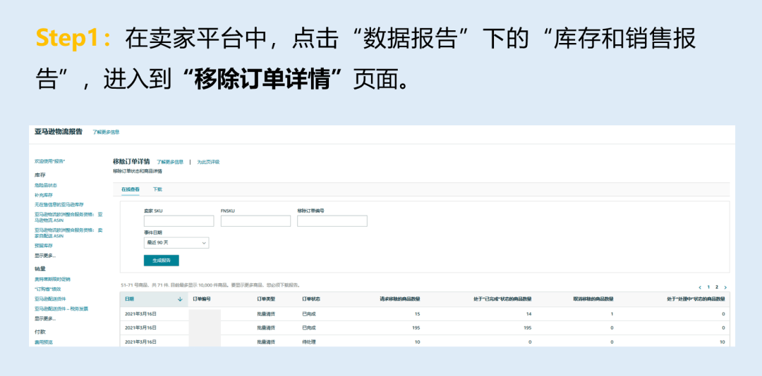 前往卖家平台,访问“库存规划”页面,您可以在 “管理冗余库存”页面、“亚马逊物流库龄”页面、“修复无在售信息的亚马逊库存”页面等选择一个或多个需要移除库存的ASIN,对选定的商品“创建移除订单”。或者您也可以下载“建议移除报告”,查看亚马逊建议您移除的商品。