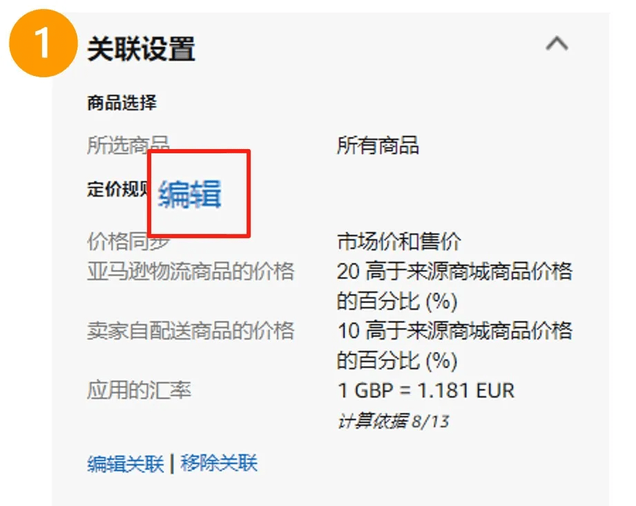 您可以通过:在【建立国际商品信息】页面右侧的关联设置 > 点击定价规则的【编辑】 > 在下拉菜单中选择“与来源站点相同,针对税费和费用进行调整“来启用这项自动定价规则。