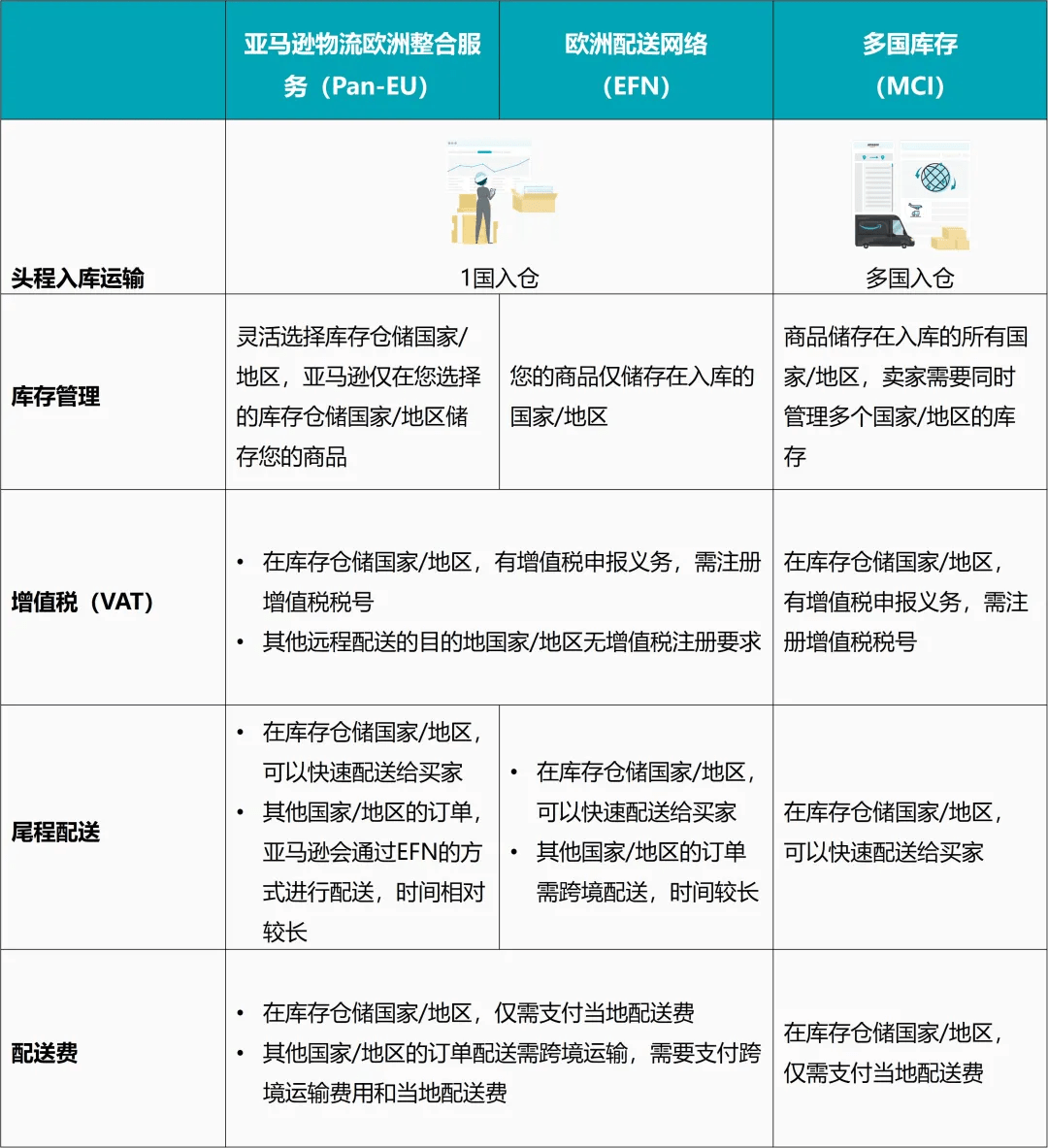 当您注册并上传了更多欧洲国家的VAT税号时,您可以根据自身需求,选择使用亚马逊物流欧洲整合服务(Pan-EU)和/或多国库存(MCI)。下图将这三种配送方式进行简单对比,供您参考👇