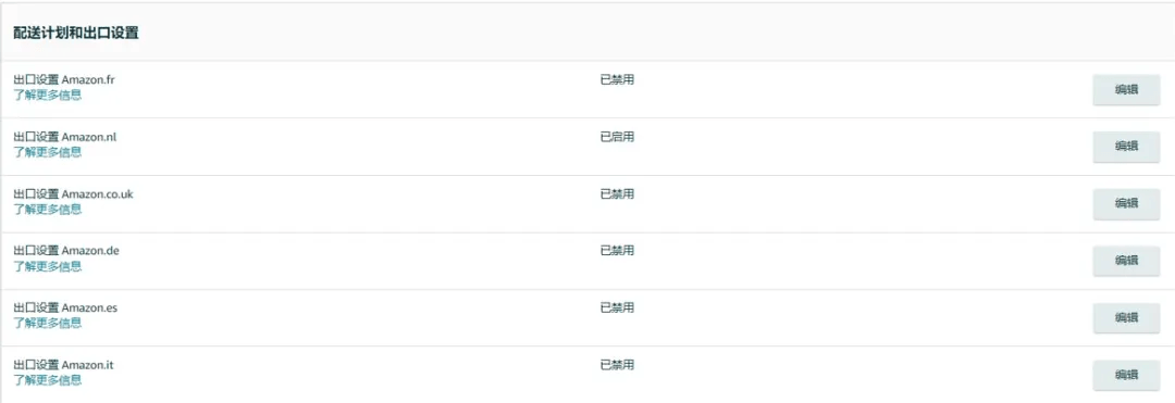 ▲启用目的国亚马逊物流“配送计划和出口设置”(【设置】 > 【亚马逊物流】 > 【配送计划和出口设置】 > “已启用”);对于从欧盟(德国/法国/意大利/西班牙)到英国的欧洲配送网络,卖家需要在所有欧盟国家(德国/法国/意大利/西班牙)启用亚马逊物流“配送计划和出口设置”