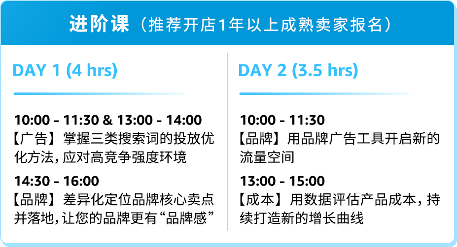 建议您报名官方讲堂特训营899进阶课,直击成熟型卖家核心业务痛点,解决店铺运营瓶颈难点!三大课题:广告优化、品牌打造、成本优化,着眼解决进阶卖家店铺运营难题,帮助店铺运营确立未来发展方向,打造品牌引爆流量!