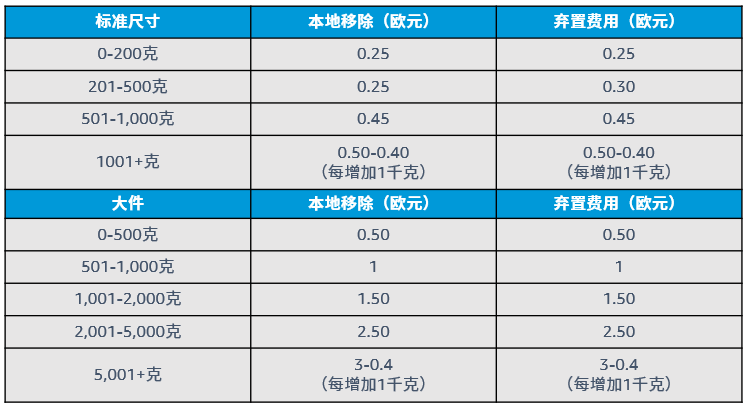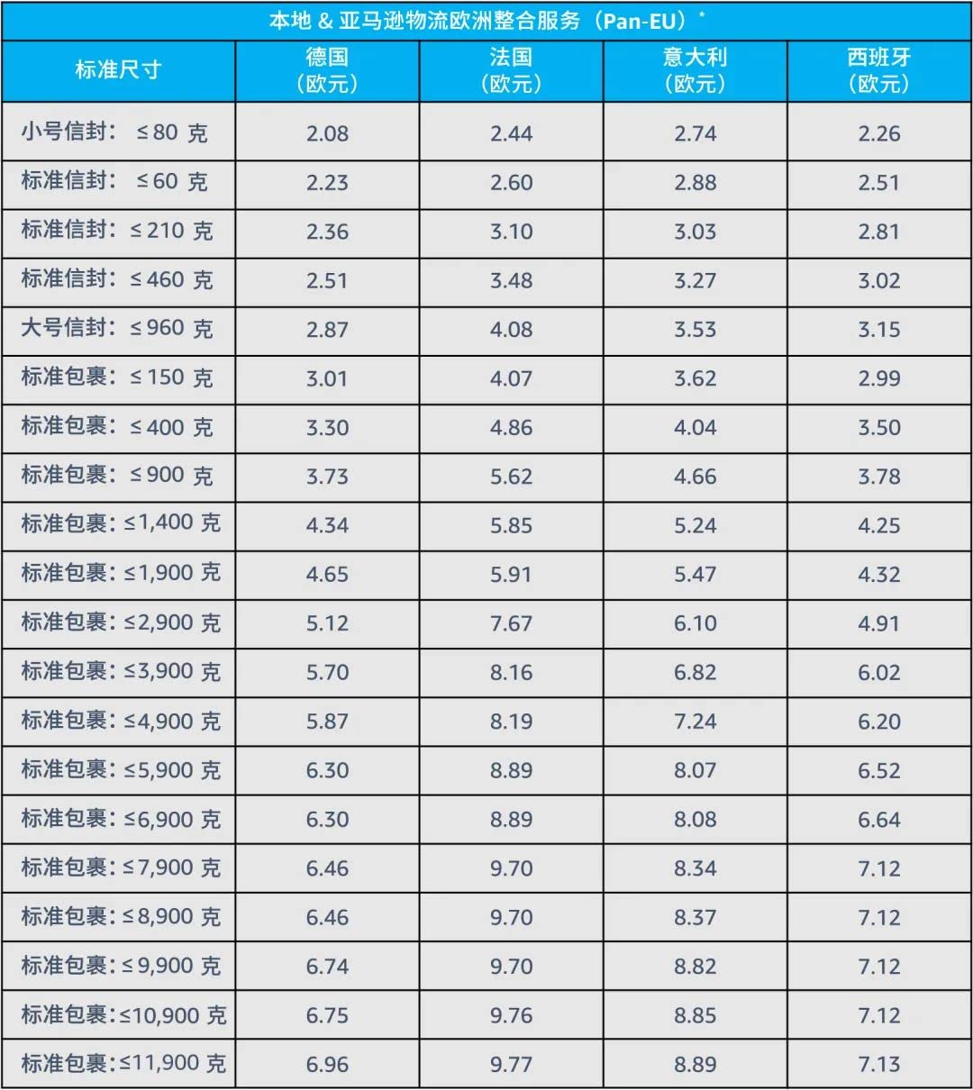 对于已注册到Pan-EU的ASIN,无论库存储存在亚马逊欧洲站点的哪个运营中心,您都只需支付下单所在商城的配送费用。费用请参见下表: