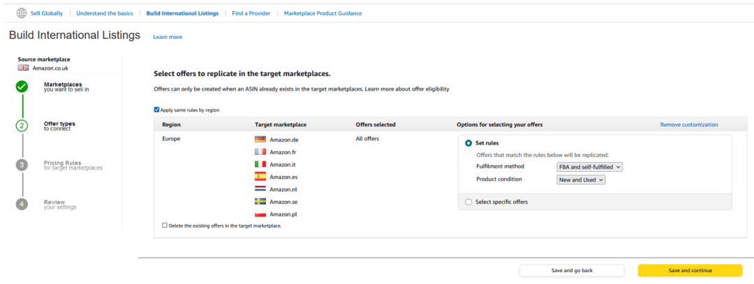 Step5:定义您要在目标商城中使用的定价规则。在每个目标商城中,您可定义特定的规则,也可单击“按区域应用相同的规则”(如果适用)。您可设置“与来源商城相同,根据税费和其他费用进行调整”,也可设置任何自定义定价规则,非常灵活。