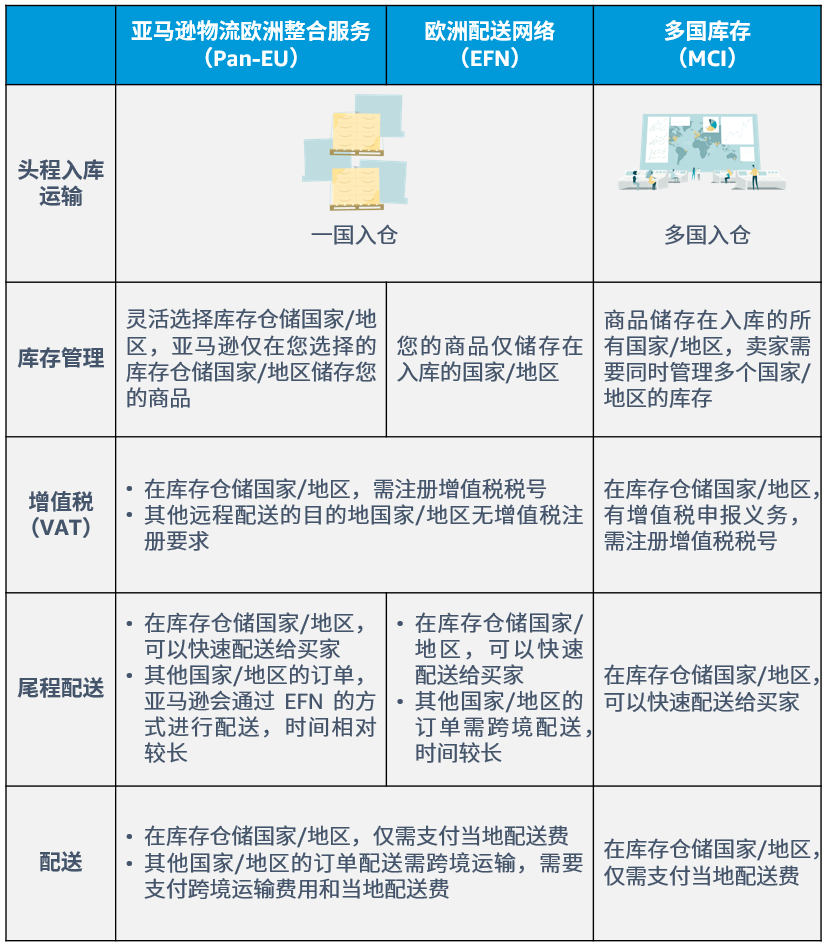 目前,亚马逊在欧洲站推出了多种物流服务,包括亚马逊物流欧洲整合服务(Pan-EU)、欧洲配送网络(EFN)、多国库存(MCI)三种。根据运营管理的灵活度,我们推荐您优先考虑使用欧洲整合服务(Pan-EU)。