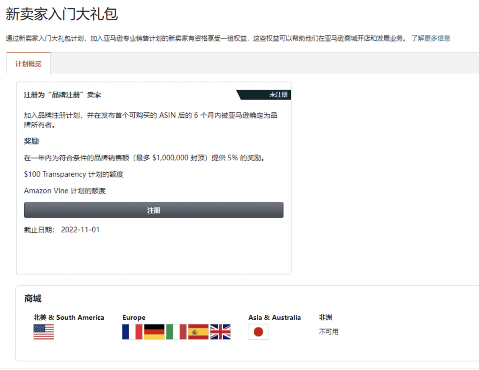 ① 如果您符合新卖家入门礼包的条件,但还未完成品牌注册,您的面板上会展示新卖家品牌福利的详情,您也可以通过下方的按钮完成品牌注册,以开始获取5%品牌销售额返还。