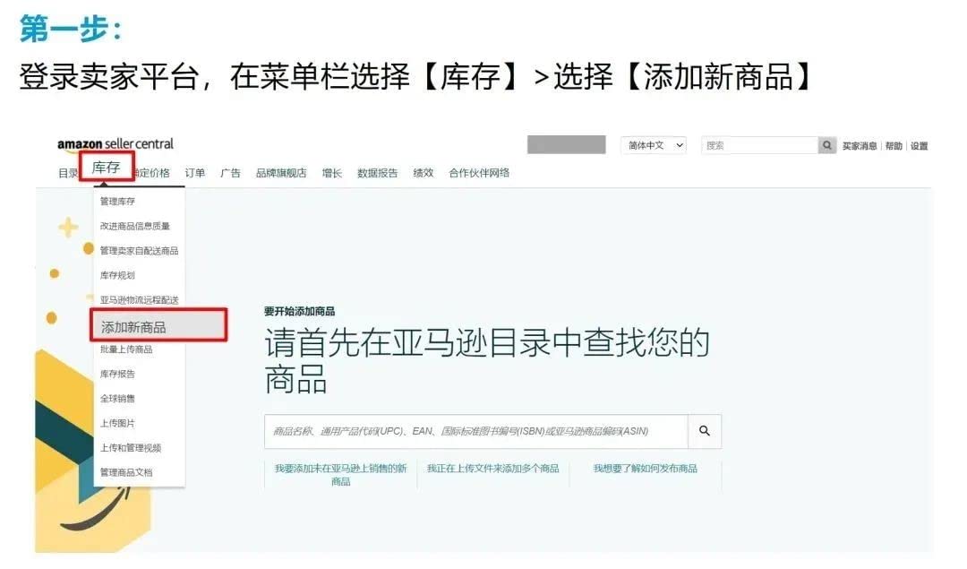 🔍 您可以参考下图中的路径,登录亚马逊卖家平台,在菜单栏中点击“库存”,进入“添加新商品”页面,使用“合规性参考”功能: