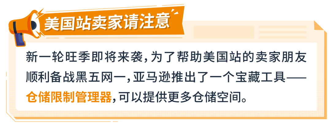 其实,美国站的卖家可通过新推出的“仓储限制管理器”申请额外仓储空间来提升您在旺季的销售表现 。