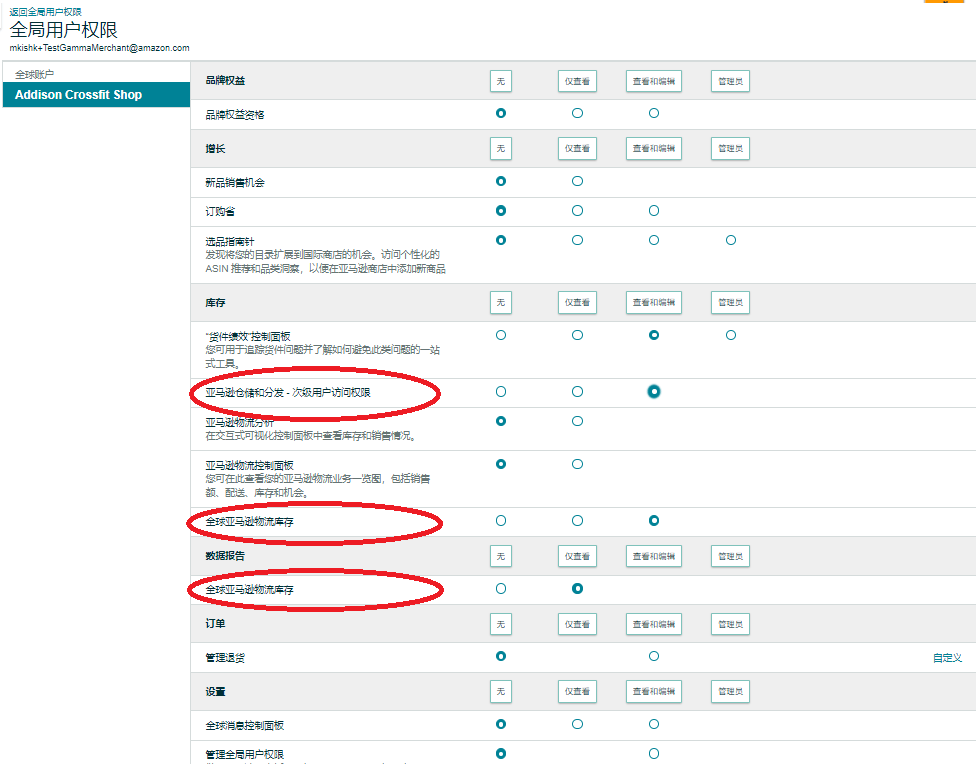 ▶ 在“库存”部分,打开“亚马逊入仓分销网络——二级用户访问”和“全球FBA库存”两个功能的权限。