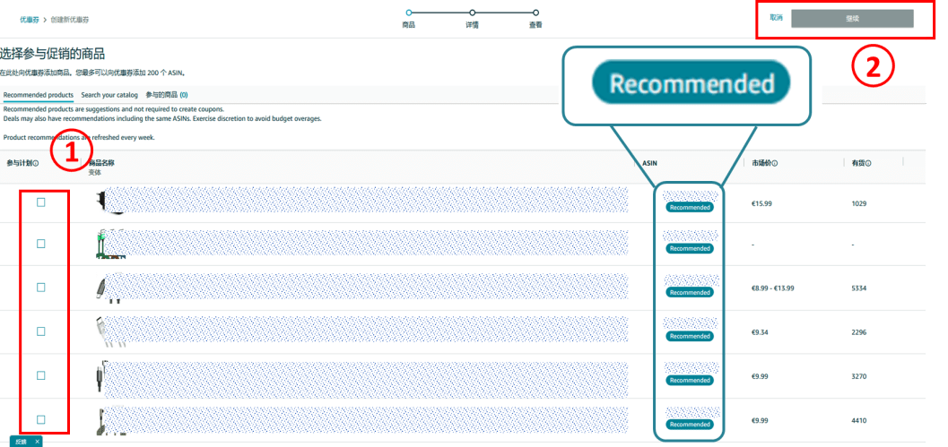 在“Recommended Products”标签下即可查看被推荐设置优惠券的商品,可在此页面勾选您想设置优惠券的商品,点击右上角”继续”按钮;