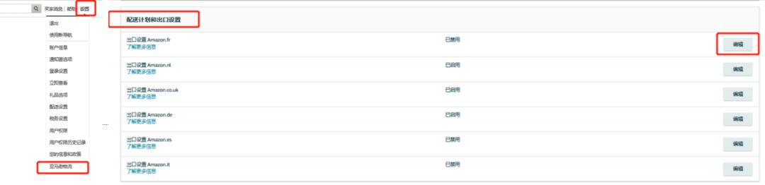 ◆【卖家平台】-【设置】-【亚马逊物流】-【配送计划和出口设置】-【编辑】