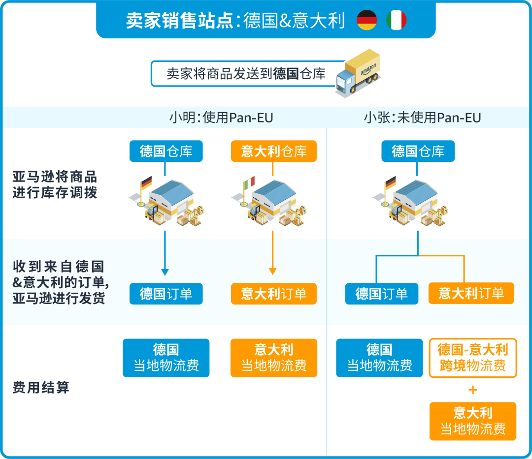 注册了德国和意大利2国税号,开启Pan-EU,入仓德国后,亚马逊根据销量预估自动分配库存到意大利仓库。当小明收到德国或意大利的订单时,仅需支付:当地标准配送费。