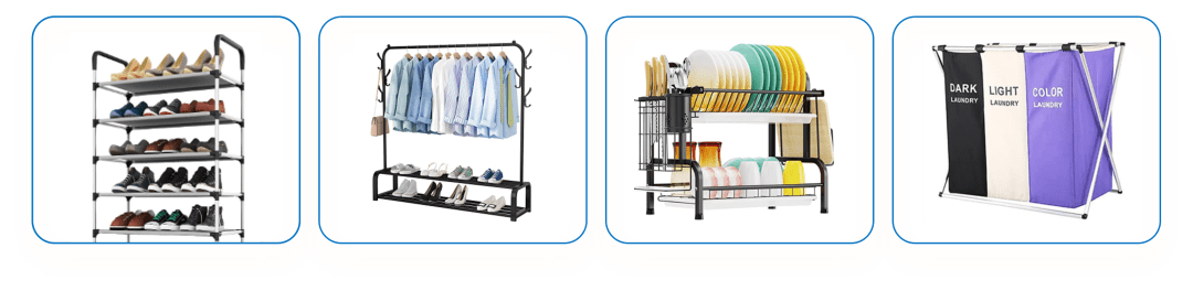 ● 热销产品举例:独立式鞋架、独立式衣架、碗碟沥水架、储物篮、挂架