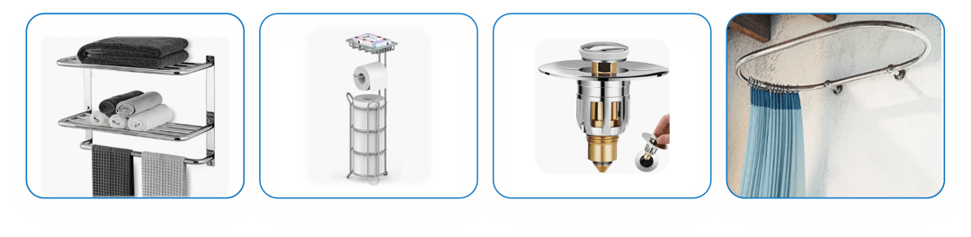 ● 热销产品举例:浴室收纳架、毛巾架、地漏、纸巾架、浴帘杆、浴室托盘