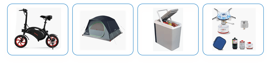 ● 热销产品举例:电动自行车、帐篷、冷却器、野营炉具、自充气睡垫、露营床、站立式桨板桨