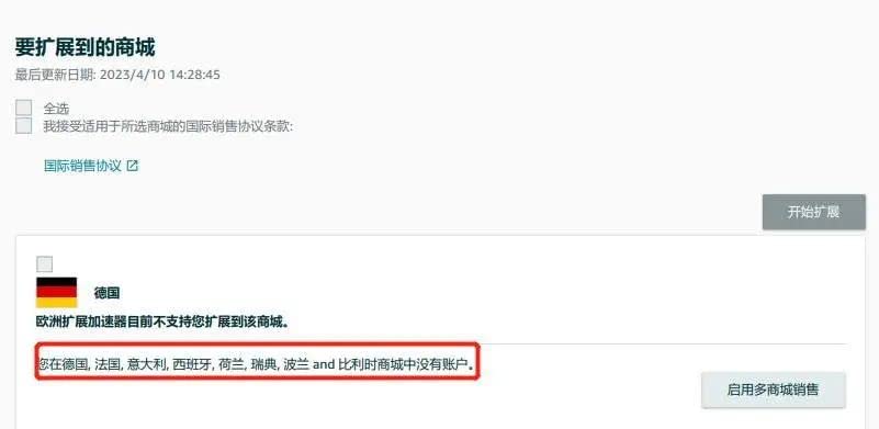进入拓展页面后,可看到符合拓展条件的国家和不符合条件的国家/地区,页面还会显示无法拓展的原因(例如,图中德国等站点不可拓展,因为该卖家在德国等商城中都没有账户。)