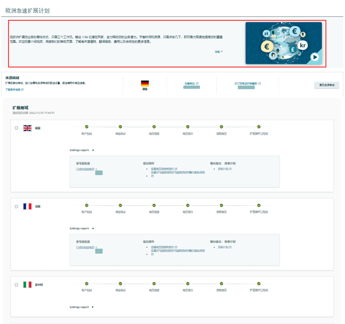 此时,FBA商品在新站点已处于活跃状态,无需操作。卖家只需在新站点中查看账户设置、商品目录和定价、运输设置和模板等。MFN商品需要卖家手动激活,拓展完成后还可查看自定义列表报告。