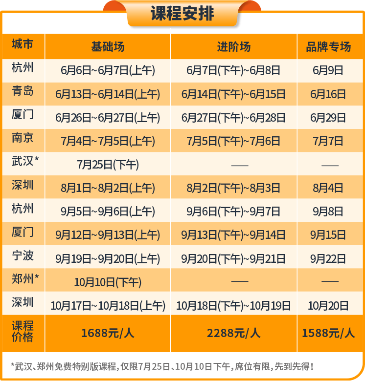 本次特训营课程包括基础场、进阶场和品牌专场三类,无论你是新手小白,还是成熟卖家,都能对号入座,找到适合自己的内容。