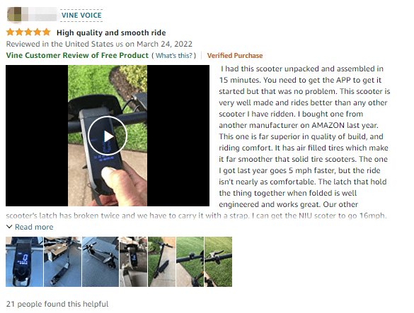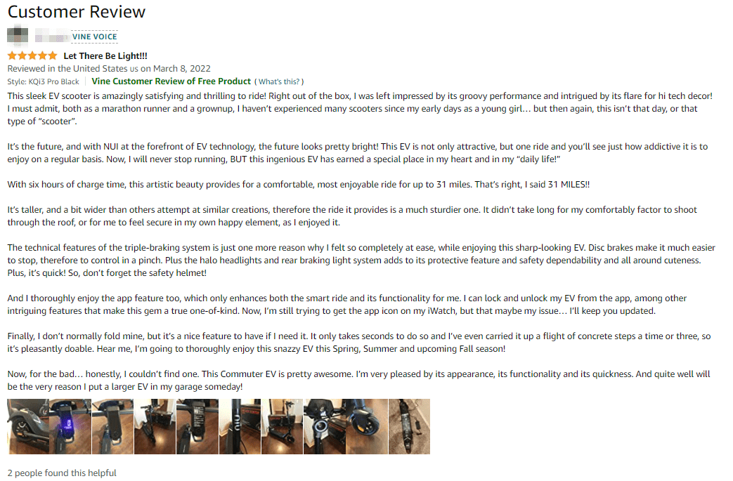 为了快速破冰,小牛在亚马逊开店之初便在北美和欧洲站点集中做了一场新品上市营销战役——在亚马逊站外,小牛与社交媒体上极限运动、电动滑板车等专业领域的KOC进行合作投放,引起声量关注,并导流到亚马逊店铺;在亚马逊站内,小牛为6个ASIN全部使用了Vine计划,并充分利用了每个ASIN能有30个产品注册Vine计划的上限,短时间内便收到了约150条图文并茂的高质量点评。因为产品过硬,许多Vine Voice社区评论者拍摄了试用视频,专业详尽地表达了愉快的产品体验。
