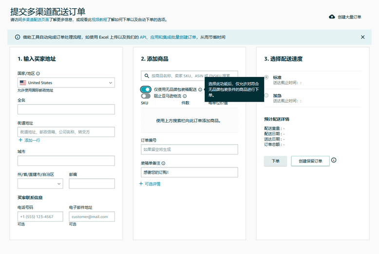 符合以上条件的卖家,可登入卖家平台,在左上角的导航栏中选择【订单】-【创建MCF订单】,并在添加商品环节中将【仅使用无品牌包装箱配送】的开关打开即可。