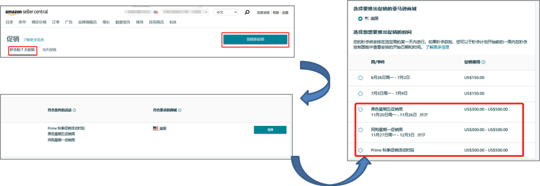 无论是平时还是旺季大促,Deal促销推荐是由系统根据ASIN的表现进行自动推荐的,卖家可以在卖家平台(路径:卖家平台-> 广告 -> 秒杀 -> 创建新促销)查看自己是否有ASIN被推荐。