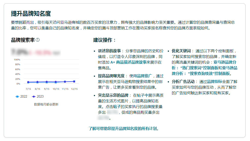 看到卖家们在品牌建设上表现出的“痛苦面具”,亚马逊立即行动,于2023年12月正式推出“品牌建设指标”,现在,该指标已经登陆卖家平台的“打造您的品牌(Build Your Brand)”页面。