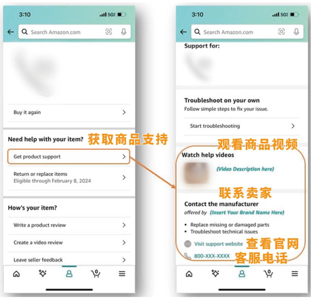 一旦使用了商品售后支持(PLS)功能,顾客将在以下界面看到卖家设置的售后视频/信息: