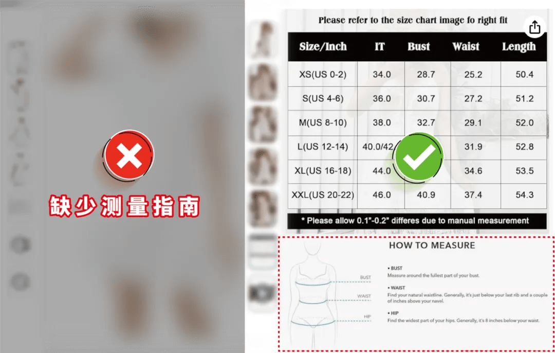有时,您的商品并不存在尺码问题,但由于消费者的测量方式与您的尺码测量方式不一致,导致对于同一尺码的理解产生偏差,从而产生退换货的损失。