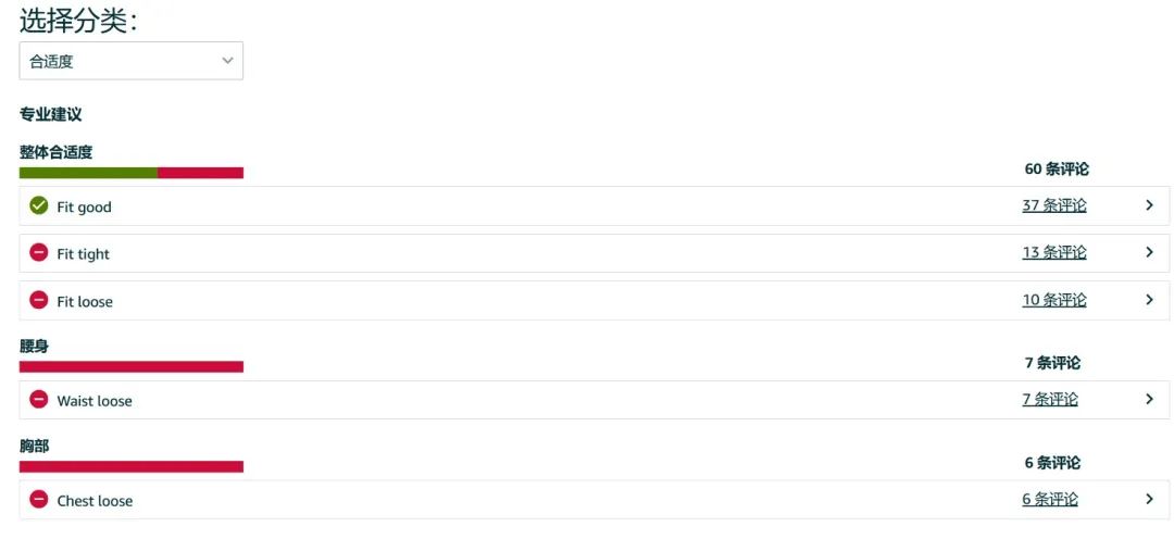 查看款式合身问题,负面反馈集中于胸围和腰围。