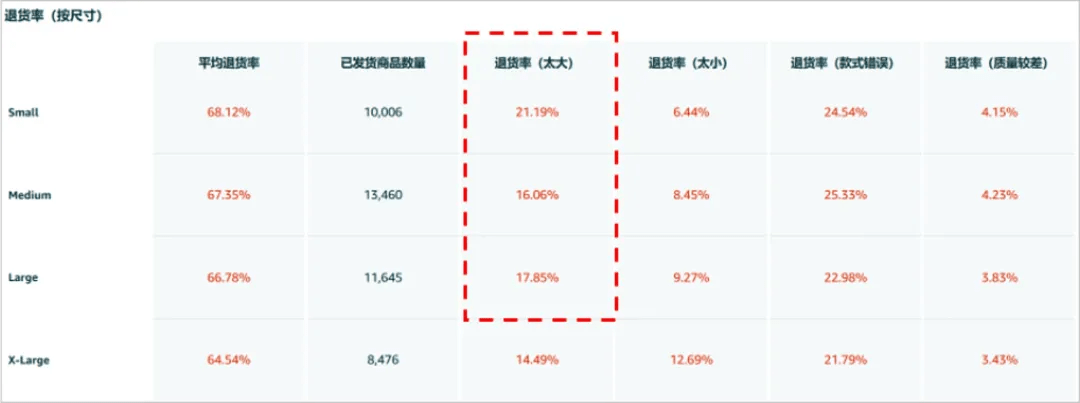 下图中的ASIN退货率明显高于同类ASIN平均表现,且退货原因主要集中在款式和尺码偏大问题上。